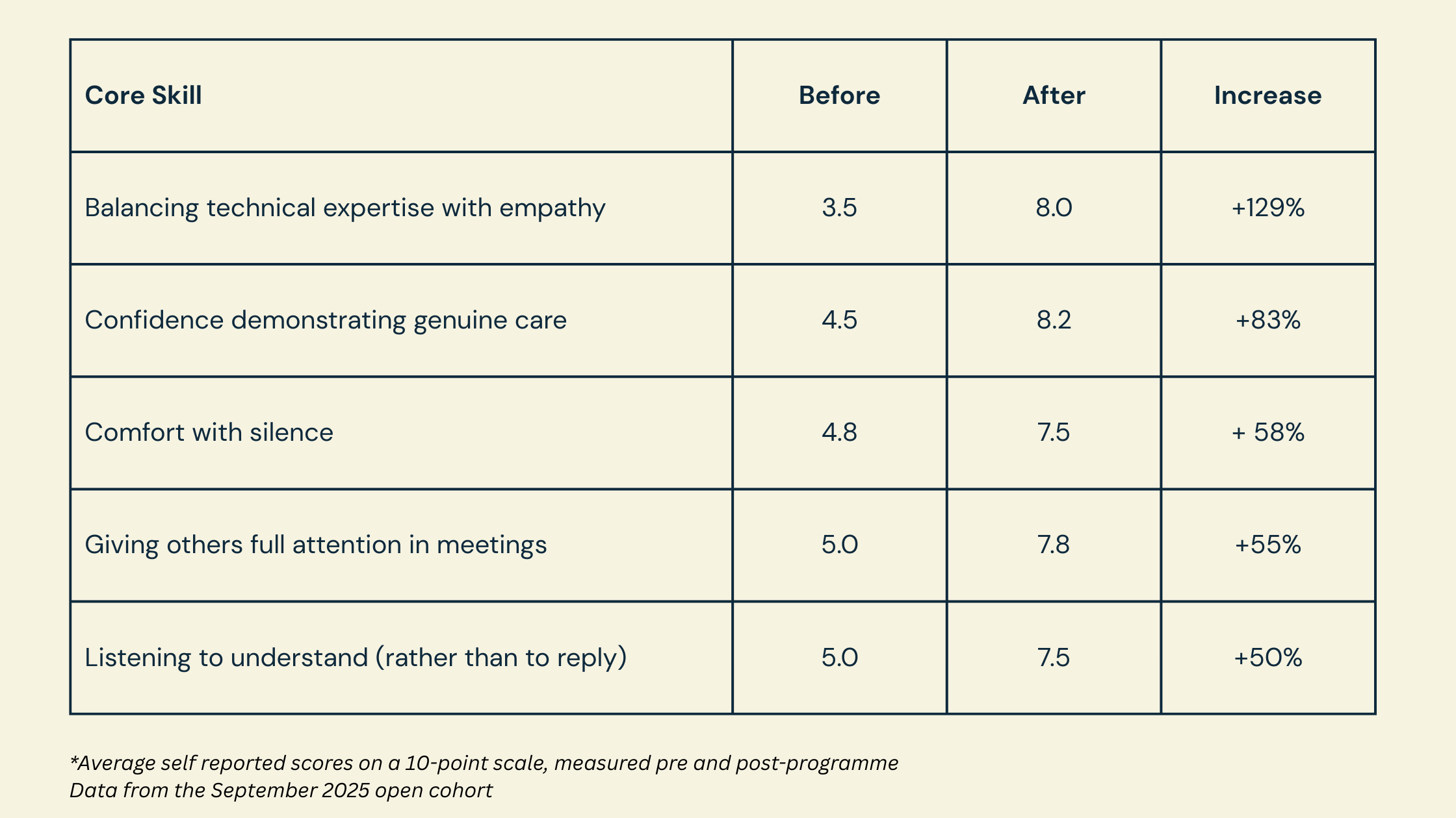 Participants in the Emotional Finance Programme report significant, measurable shifts in their emotional intelligence and relational skills - the kind that changes how they show up in every client conversation and impacts conversion, engagement and loyalty.
